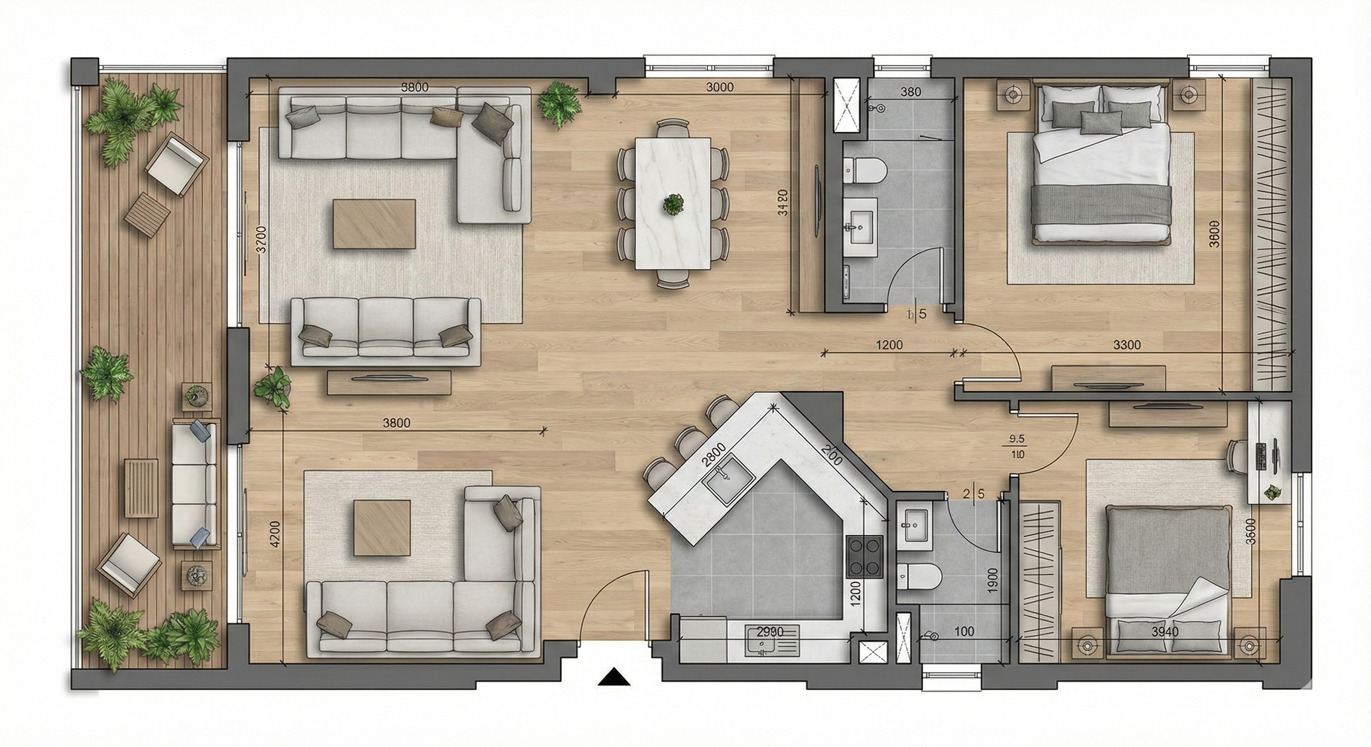 למעצבים שעובדים עם סקצ'אפ או תוכנות דומות, ננו בננה משתלב בצורה מושלמת. אתם בונים את המודל הבסיסי בסקצ'אפ – קירות, חלונות, רהיטים בצורות פשוטות – מייצאים צילום מסך, והכלי הופך את זה להדמיה פוטו-ריאליסטית. הוא מזהה מה זה קיר, מה זה חלון, מה זה רהיט, ומלביש על כל אלמנט את הטקסטורה המתאימה בלי לשנות את הצורה או הפרופורציות. זה אומר שאתם שולטים במבנה של החלל, אבל חוסכים את השעות של עבודה על חומרים ותאורה.